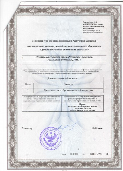 Приложение к лицензии Документ подписан электронной подписью Серийный номер 603332450510203670830559428146817986133868575803 Директор/Заведующий Гаджиагаев Неджеф Гаджиханович Дата подписания документа 24.11.2021 18:11:07 (скачать) (посмотреть) (текст документа)