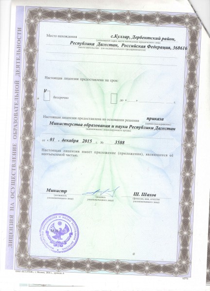Лицензия Документ подписан электронной подписью Серийный номер 603332450510203670830559428146817986133868575803 Директор/Заведующий Гаджиагаев Неджеф Гаджиханович Дата подписания документа 12.01.2022 13:36:07 (скачать) (посмотреть) (текст документа)